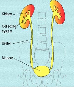 The kidneys are responsible for the production of urine. Urine drains into the bladder via two hollow tubes called the ureters. The urethra connects to the base of the bladder and drains the urine outside the body. The kidneys, ureters, bladder and urethra are collectively known as the urinary system or urinary tract.